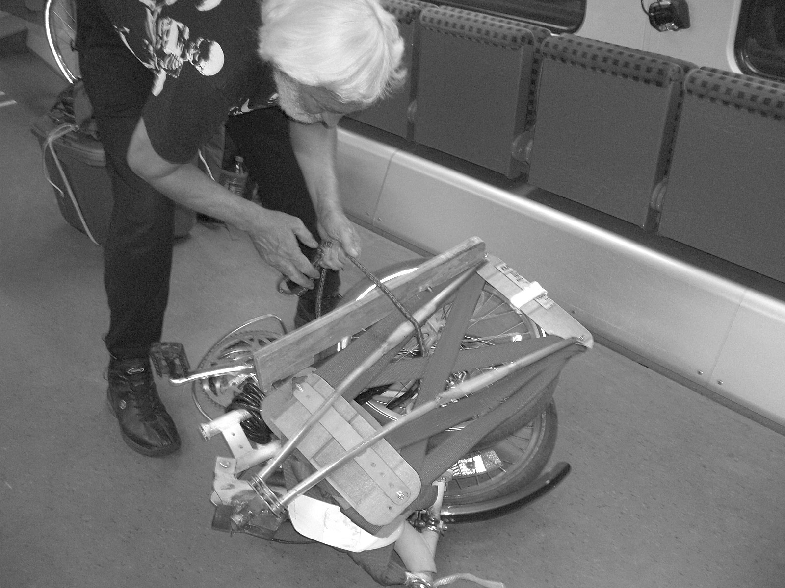 After 6 weeks I now own cab-bike no. 11, or it owns me. Still fiddling with a few things. German and Bernd of Cab-bike got me into Reinhold’s old bike. Has been ridden, been in a few wrecks, had many tests and been used in a few experiments, but it is up and rebuilt. Bernd set me up. I slept on the couch 3 days a week for a month and spent long days in his shop. His wife Bea and two kids were very gracious to me.