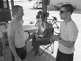 Before climbing into the bike Matt had pre-cooled his body by lying in a large trough of ice water. The water looked pretty inviting to the rest of us that had been standing around in the heat as well!