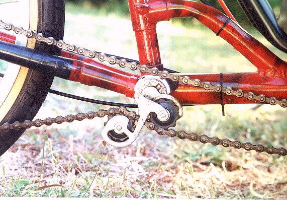 The plastic chain guard beside the big chainring has been smashed off after an accident. The trike was parked on a slope, it rolled away and ran into the side of a car. Luckily for me it hit exactly in the gap between the front and rear door so bent the cogs a little but didn't dint the car. Really makes me feel like I need a handbrake so for the moment I've mounted a light rear bike stand. This also helps in rear wheel/derailleur adjustment and puncture repairs. I've never been so happy with only having braking only on the rear, especially in the area I ride because of the steep hills. If I was to build another I'd add front calipers to the handlebars as on my Child's trike. (see the new additions section) Also seen on the Trisled and Swift, /7trikes.htm and School built trikes at qldpprix/98/cabooltu.htm